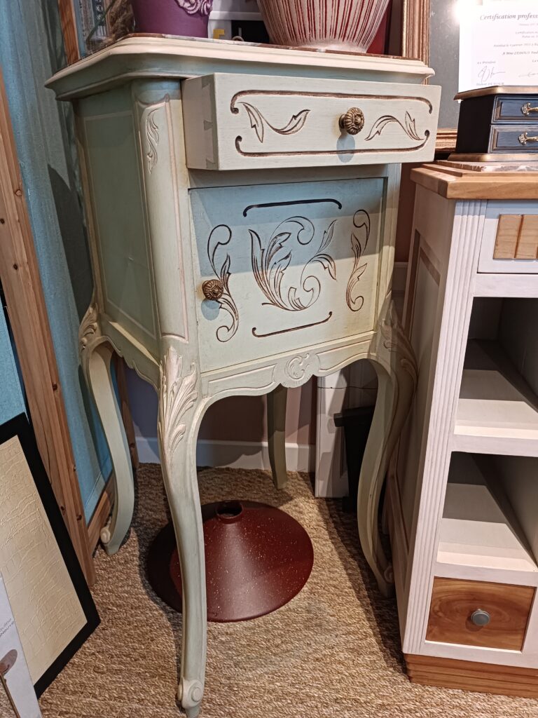 Commode 4 tiroirs Art déco, bleu turquoise, patine et décors cuivrés